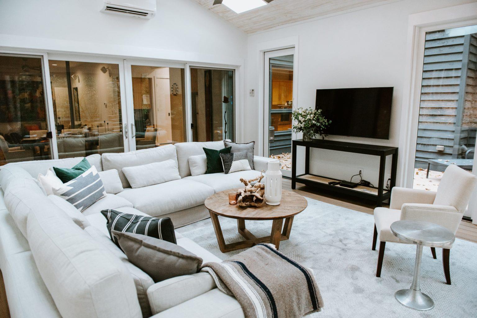 The homeowners wanted an indoor living space that could easily transition into an outdoor living space when the weather was nice. Our solution was tri and bi-fold doors that slid open completely giving way to nature on two sides. The room can be heated in colder months and cooled in warmer months. The deck’s gas firepit has a dedicated line making smores outside under the trees always an option.