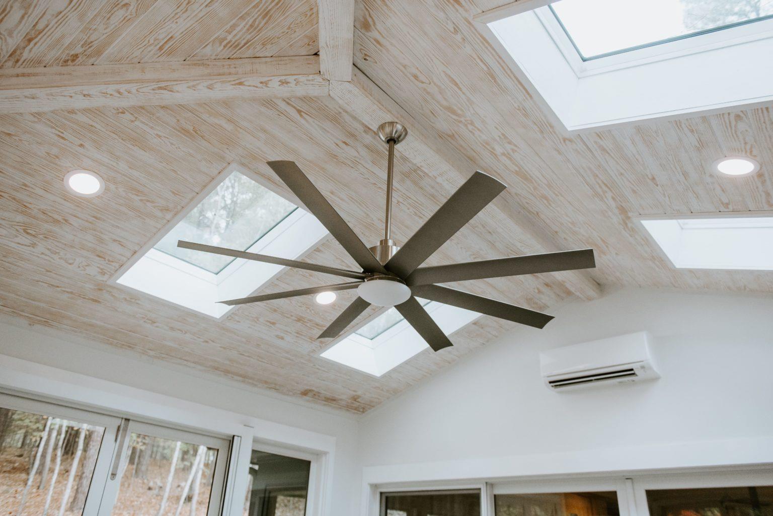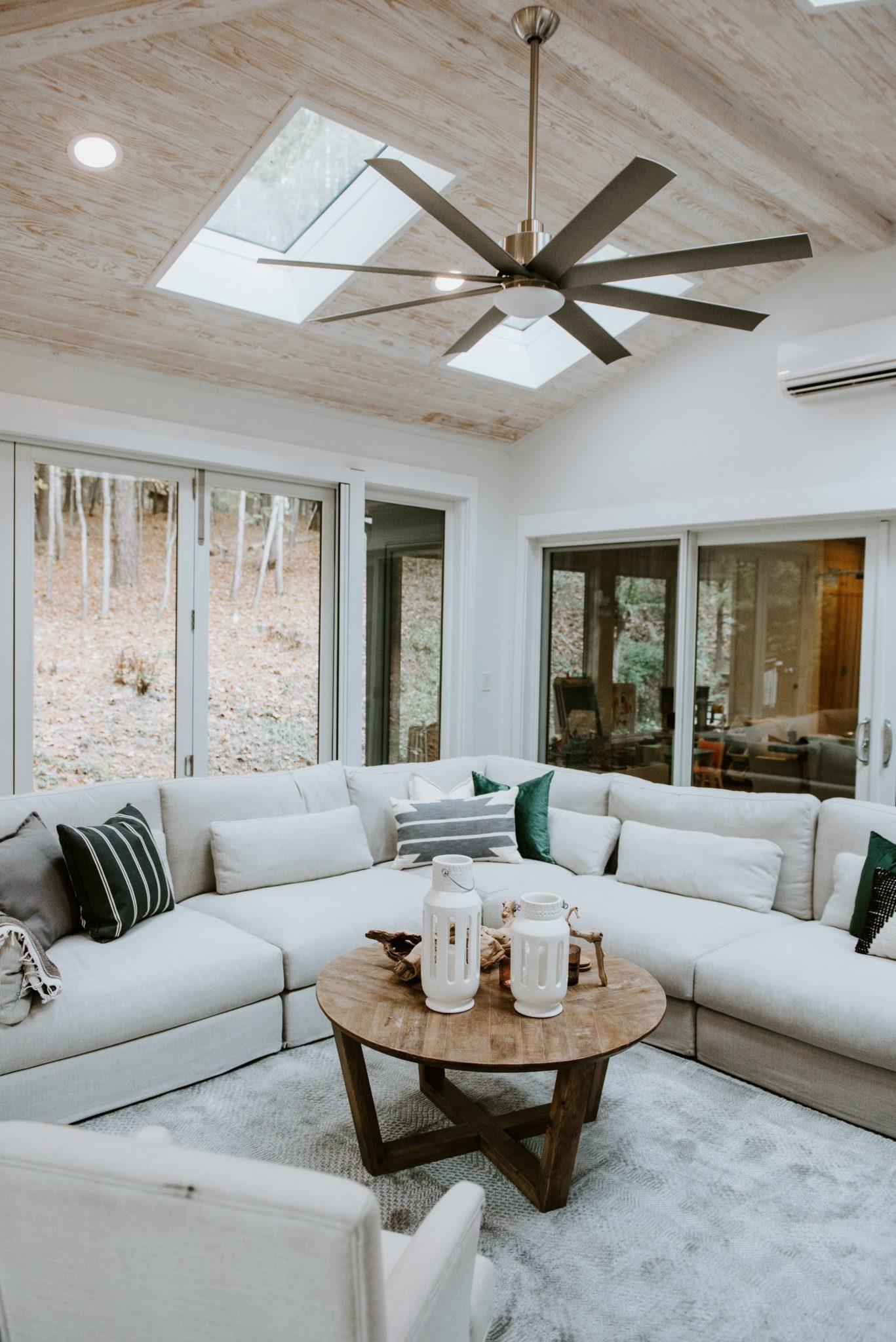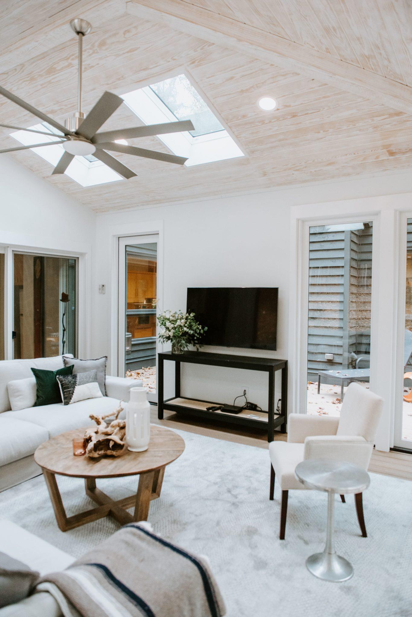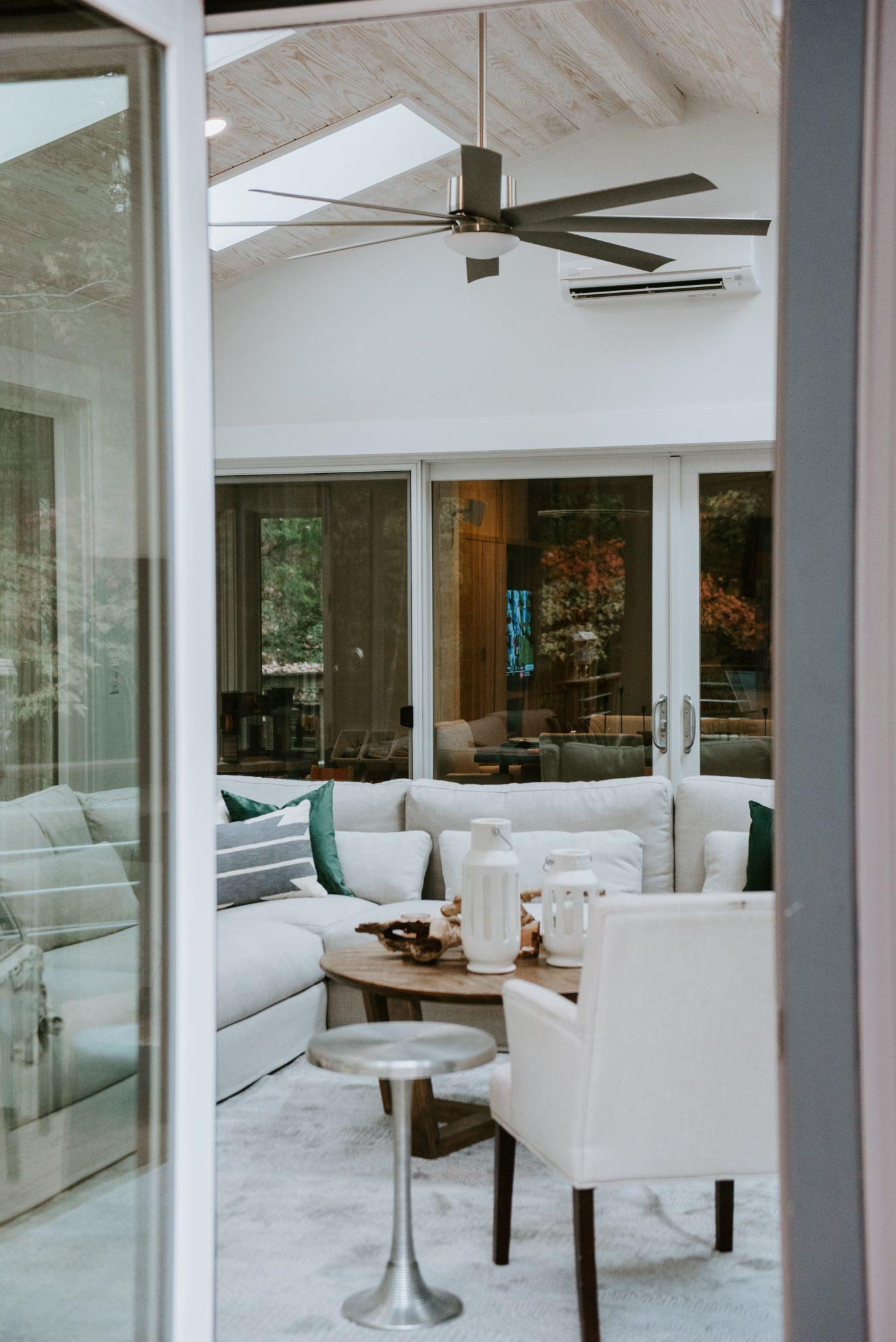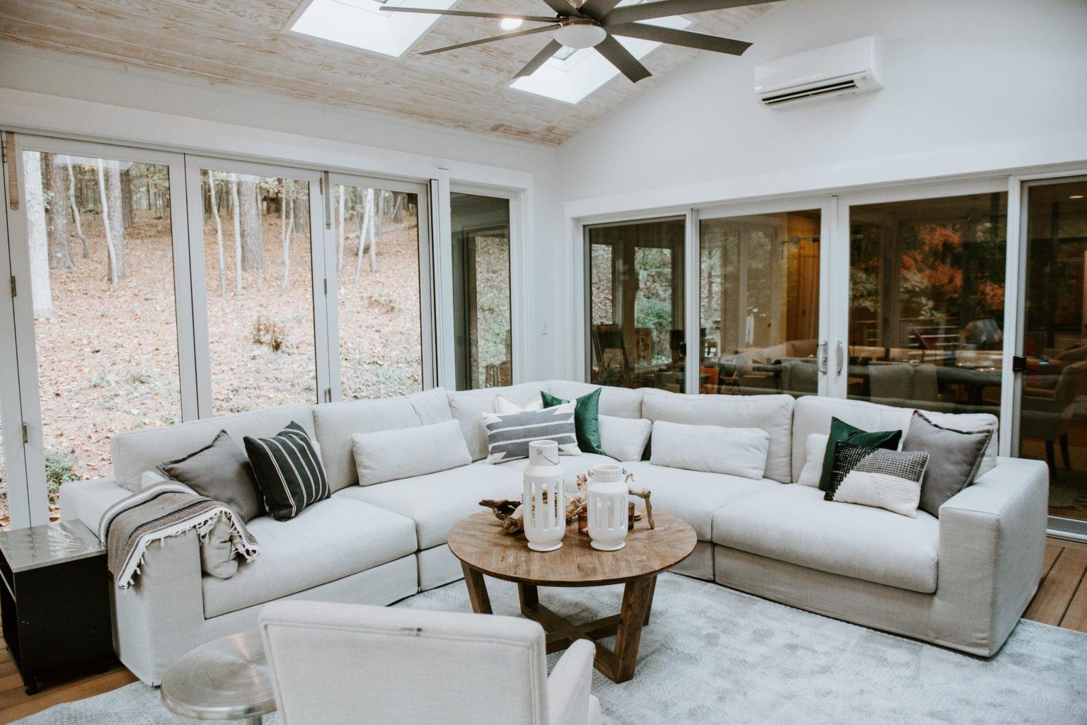 The homeowners wanted an indoor living space that could easily transition into an outdoor living space when the weather was nice. Our solution was tri and bi-fold doors that slid open completely giving way to nature on two sides. The room can be heated in colder months and cooled in warmer months. The deck’s gas firepit has a dedicated line making smores outside under the trees always an option.