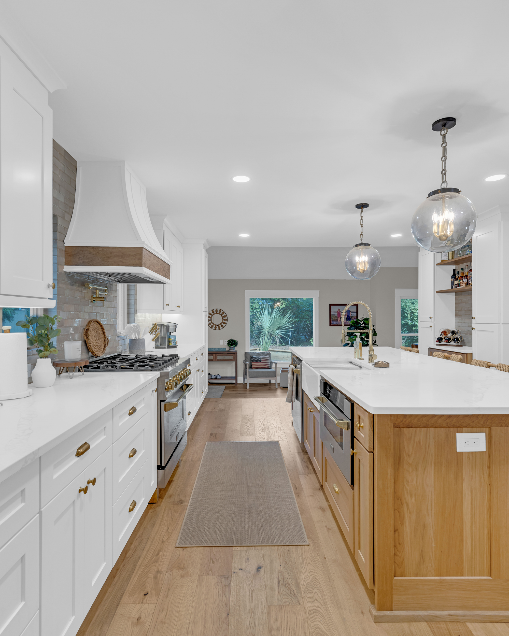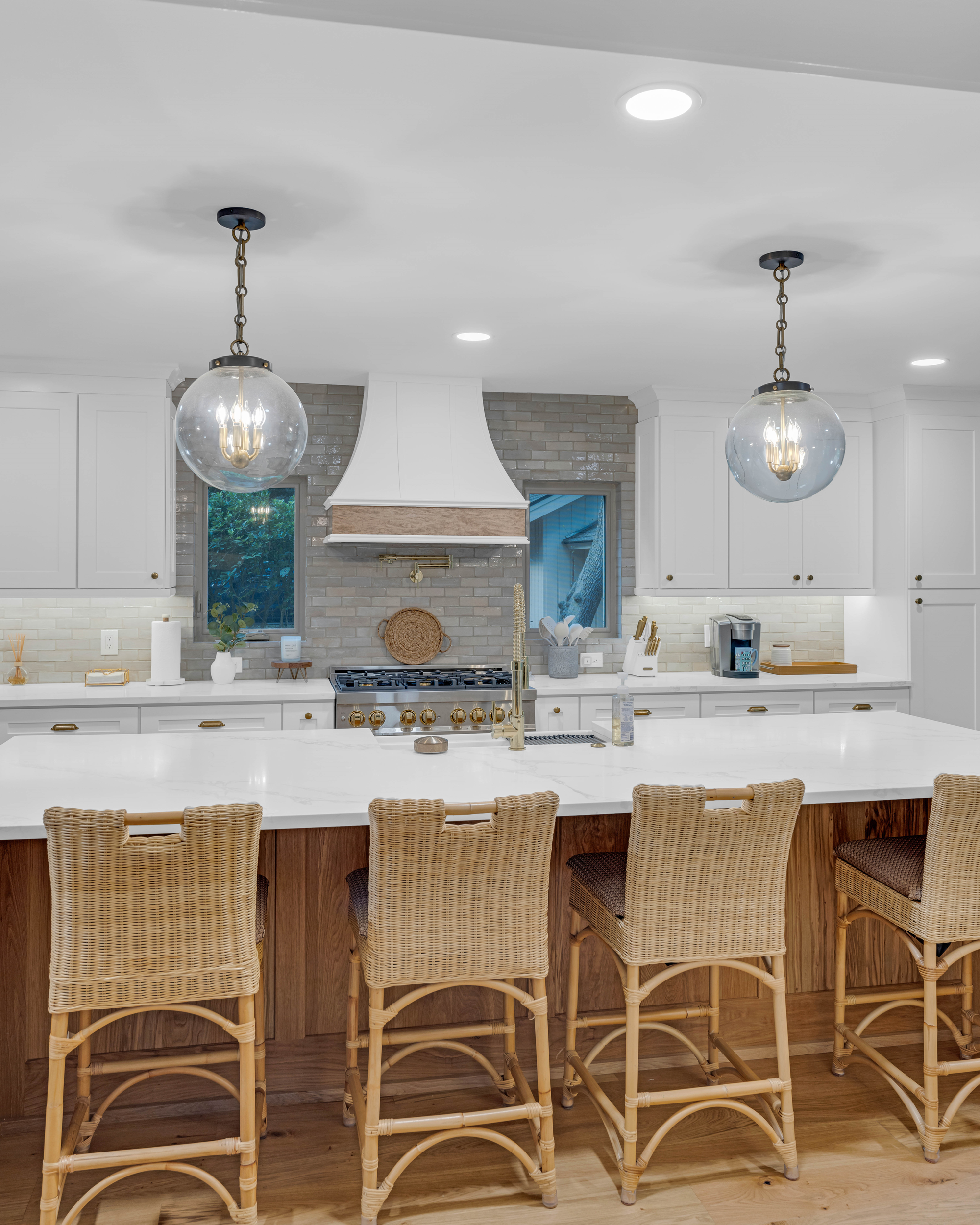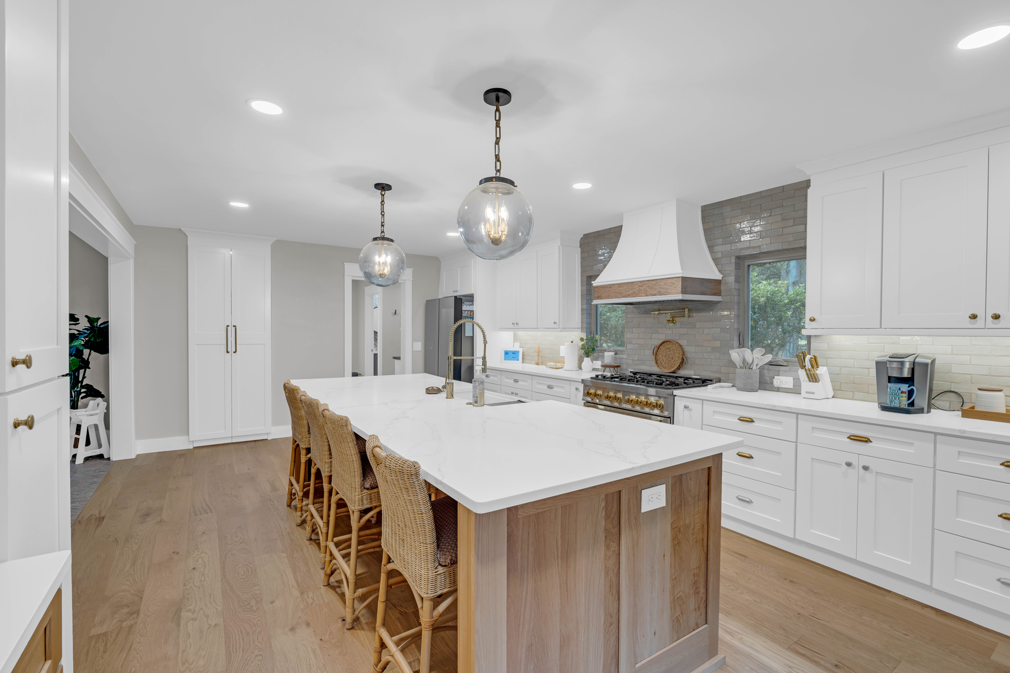 Crisp white custom cabinetry provides a clean, classic foundation, while warm wood accents on the island introduce contrast and natural texture. Quartz countertops extend across the perimeter and oversized island, offering generous prep space and durable beauty. Statement globe pendants draw the eye upward and add softness to the room’s clean architectural lines.