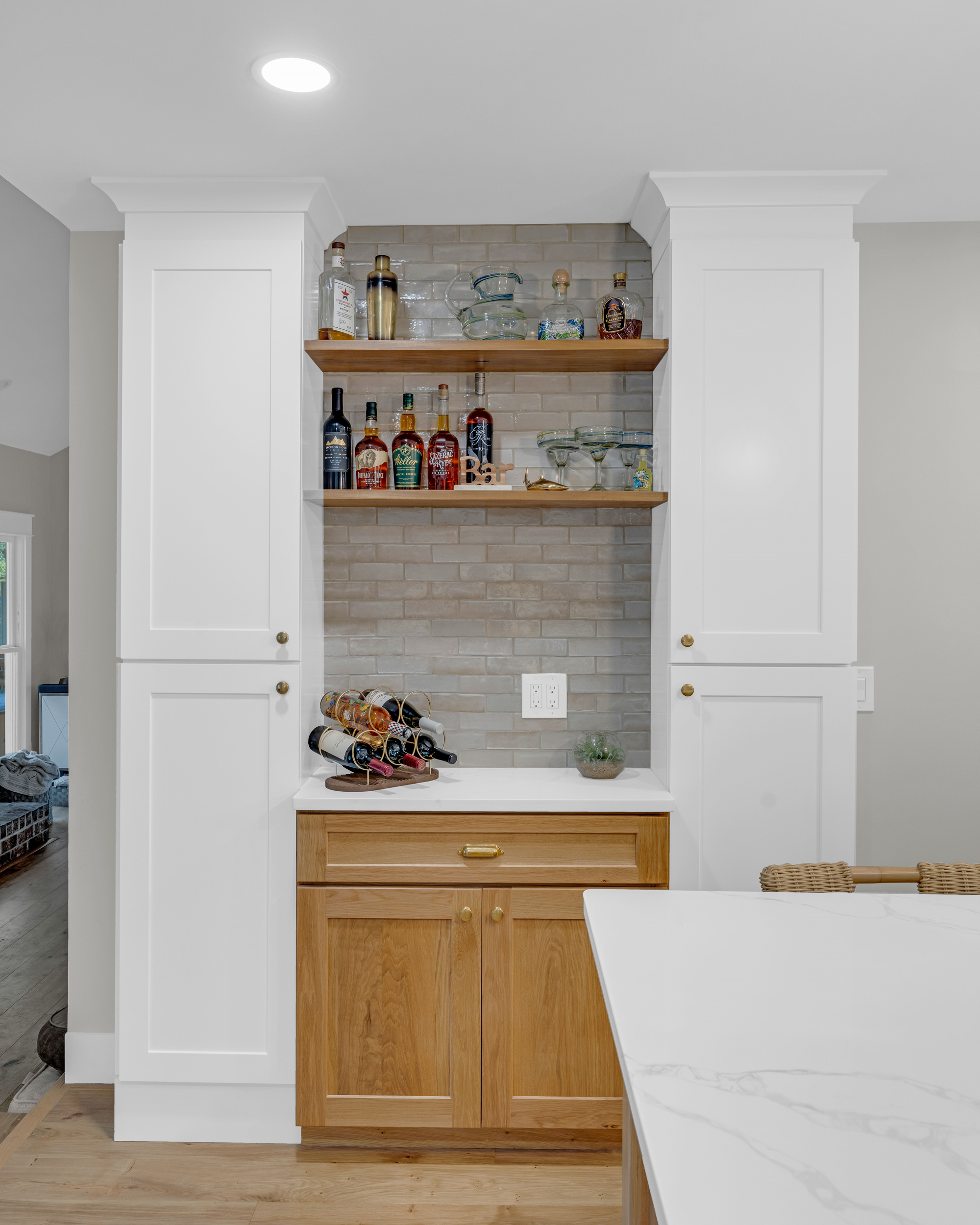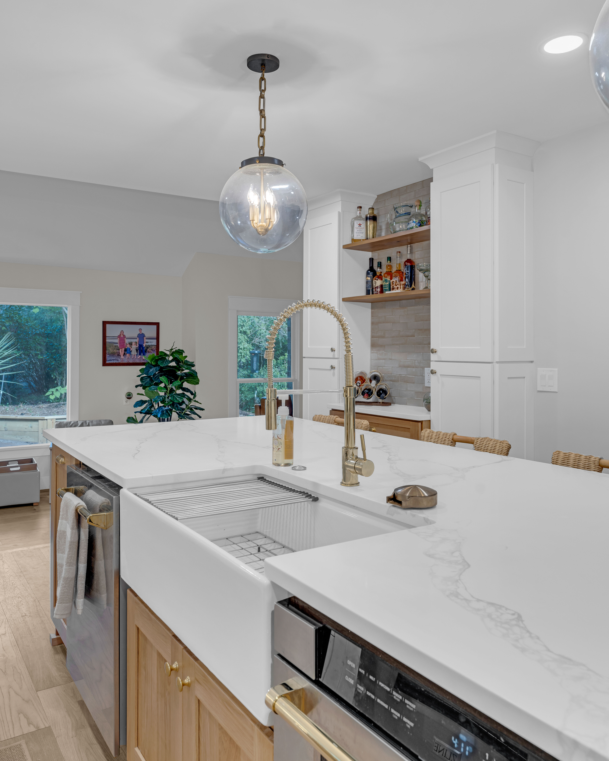 Thoughtfully integrated storage solutions, including a walk-in pantry and built-in bar area, improve organization while supporting a seamless, clutter-free aesthetic. This Port Royal Plantation kitchen renovation reflects HHI Builders’ commitment to craftsmanship, intentional design, and creating kitchens that feel both luxurious and livable.