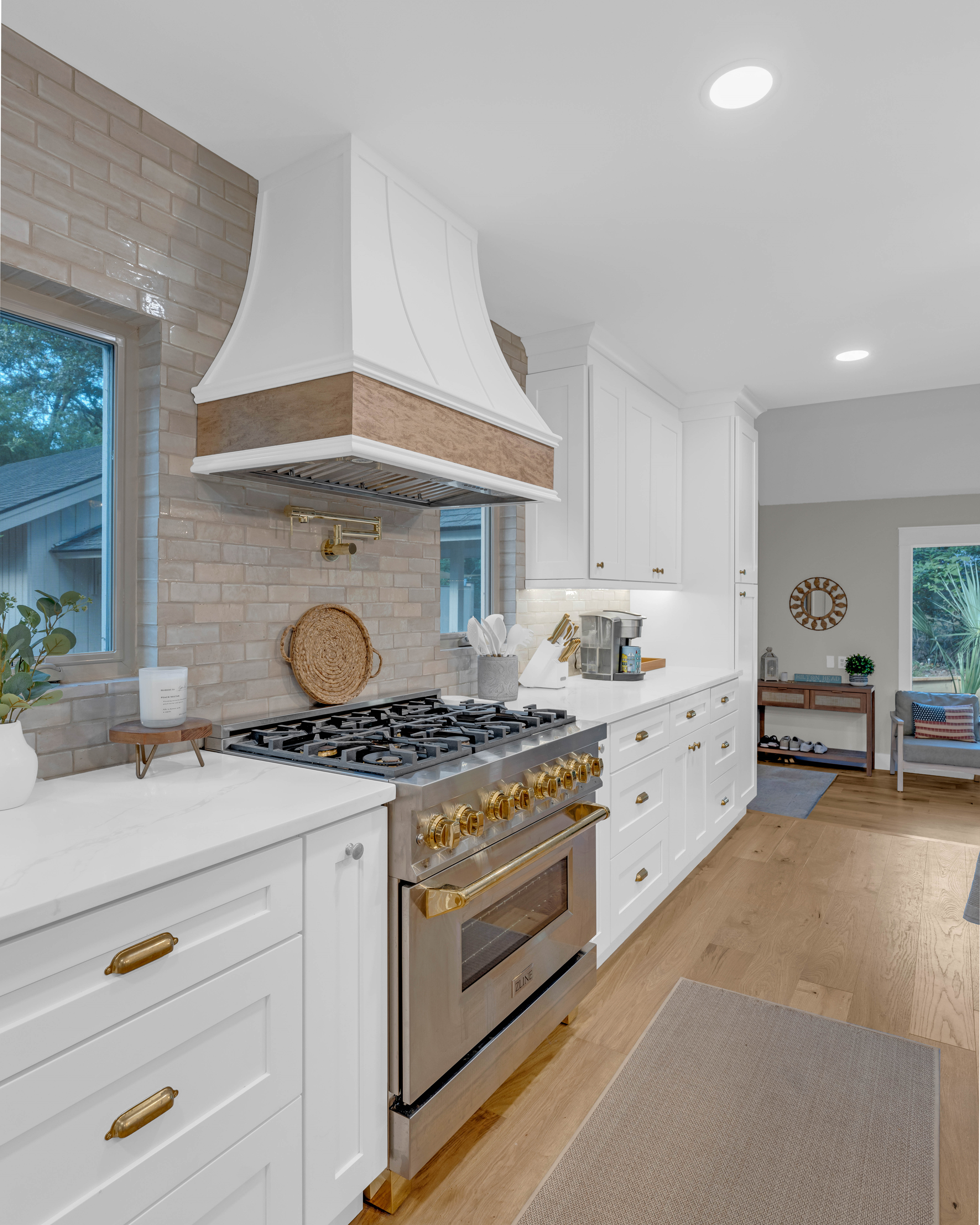 A custom vent hood framed with subtle wood detailing serves as a focal point above the gas range, paired with a neutral tile backsplash that adds depth without overpowering the design. Brass hardware and fixtures bring warmth and cohesion throughout the space, complementing the wide plank wood flooring that grounds the kitchen and enhances flow into adjacent living areas.
