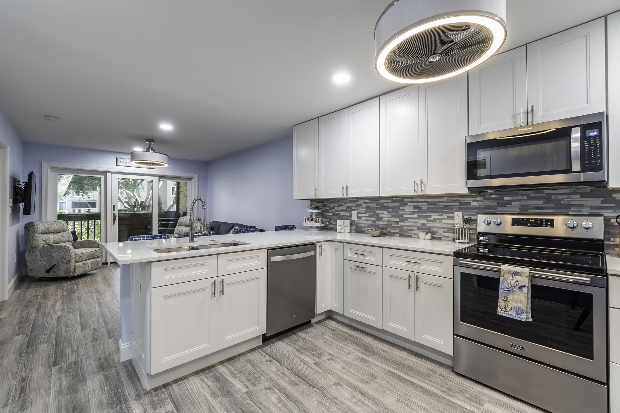The kitchen island serves as a focal point, featuring a durable and beautiful quartz countertop. This space is perfect for both meal preparation and casual dining, with comfortable bar seating that encourages family and friends to gather. Enhanced lighting fixtures, including under-cabinet lights and a contemporary ceiling fan, ensure the kitchen is bright and welcoming.