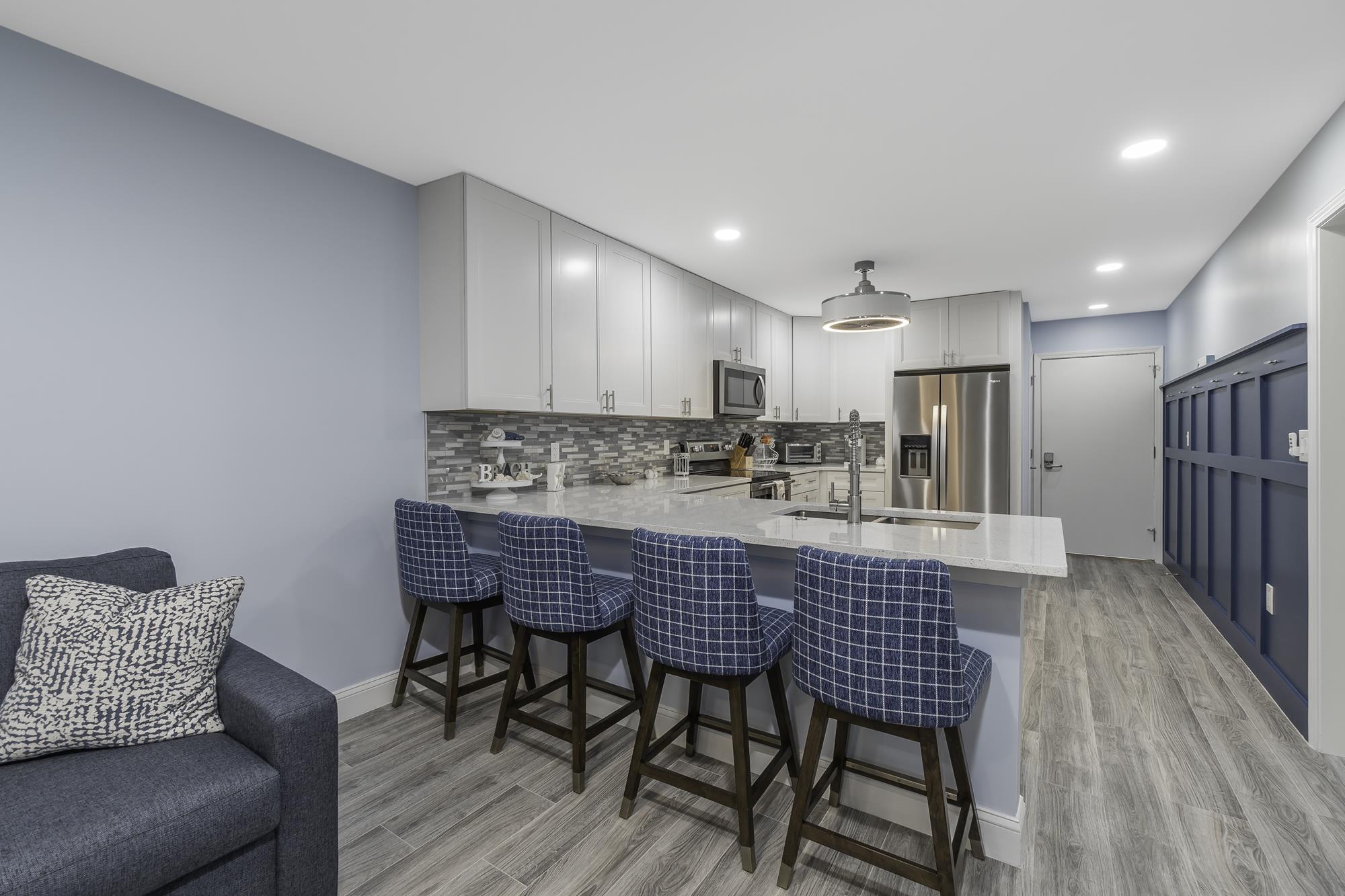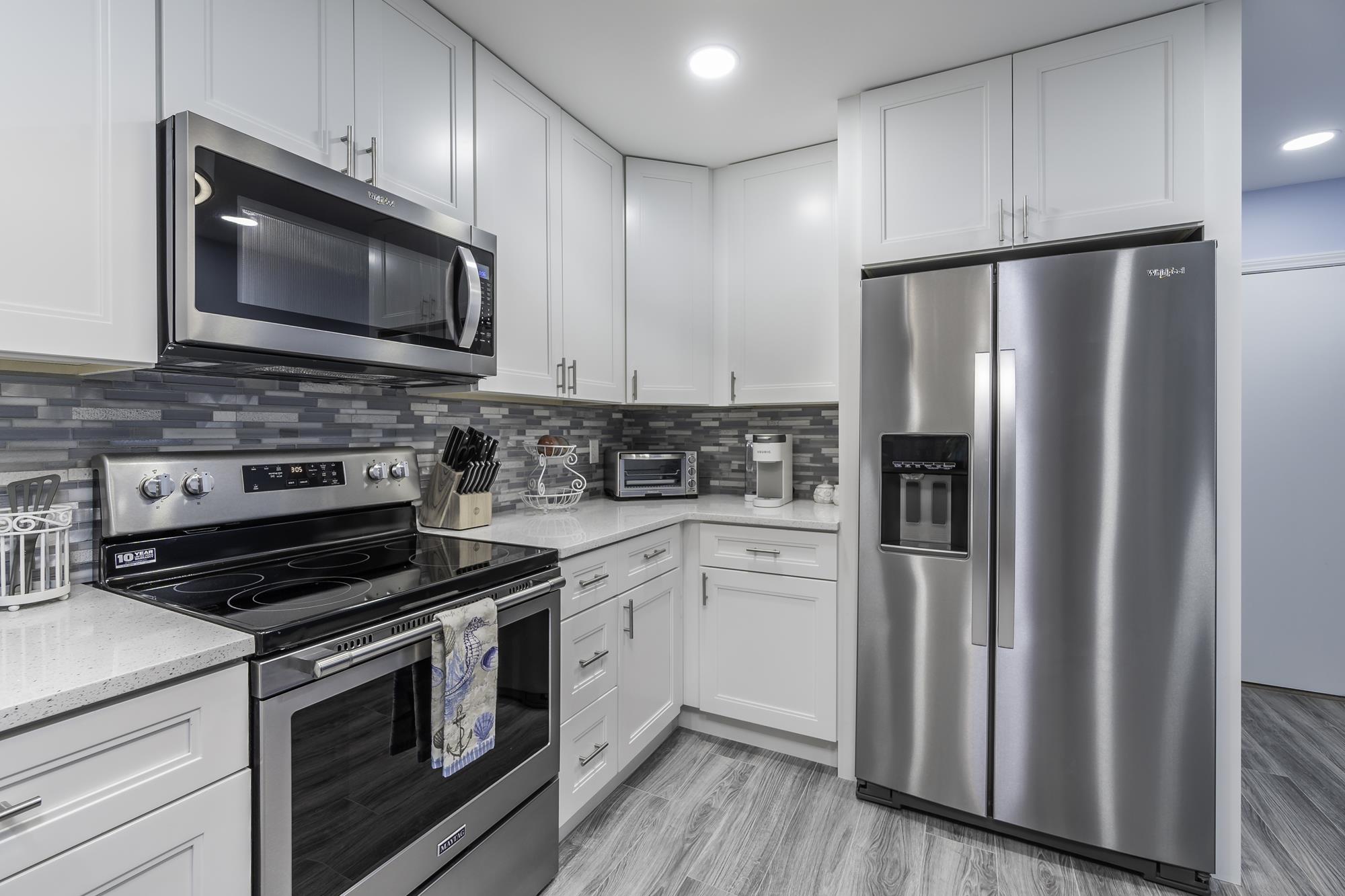 The kitchen is the heart of any home, and for Unit #1124, we aimed to create a space that is both stylish and highly functional. The outdated cabinetry and appliances were replaced with sleek, white shaker cabinets that offer ample storage and a fresh, clean look. The addition of a sophisticated backsplash with a blend of gray and blue tiles complements the new stainless-steel appliances, including a modern oven, microwave, and refrigerator.