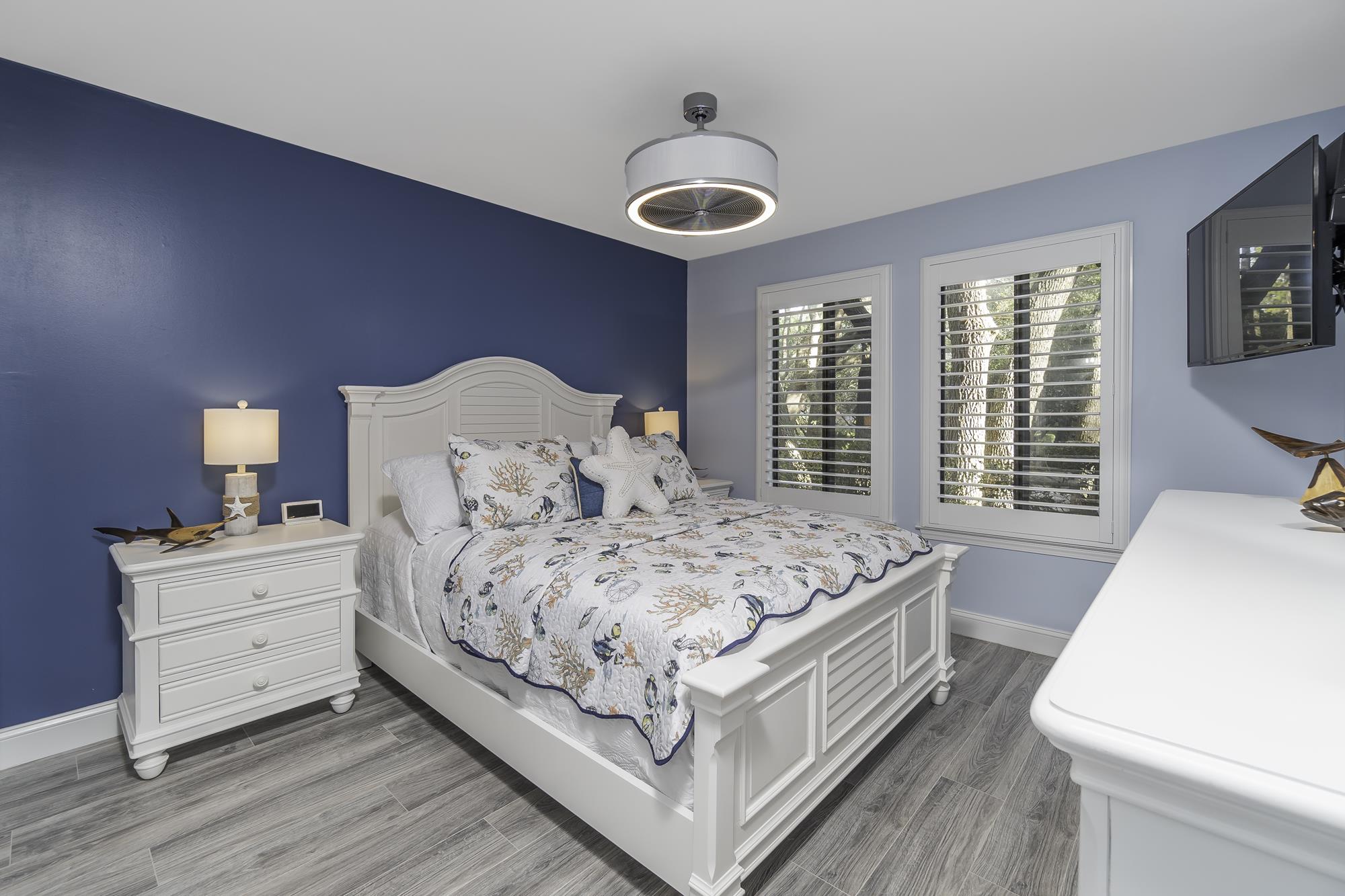 The bedrooms in Unit #1124 were given a complete makeover to create serene and inviting sanctuaries. Fresh paint in soothing colors, new flooring, and upgraded lighting fixtures were added to enhance the overall aesthetic. The master bedroom now boasts a feature wall with a rich blue hue, adding a touch of luxury and sophistication. High-quality bedding and furniture complete the transformation, making these rooms perfect for rest and relaxation.