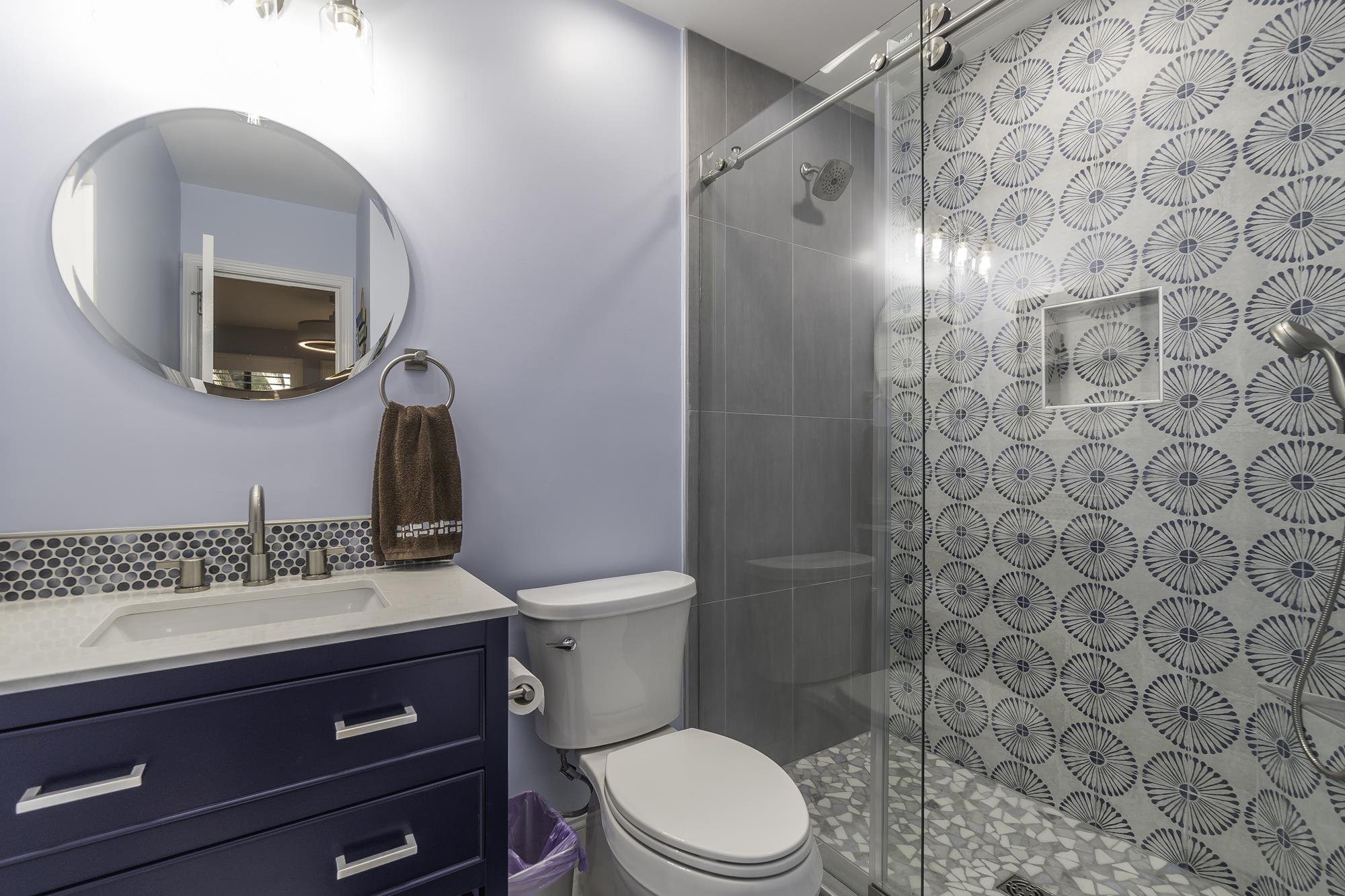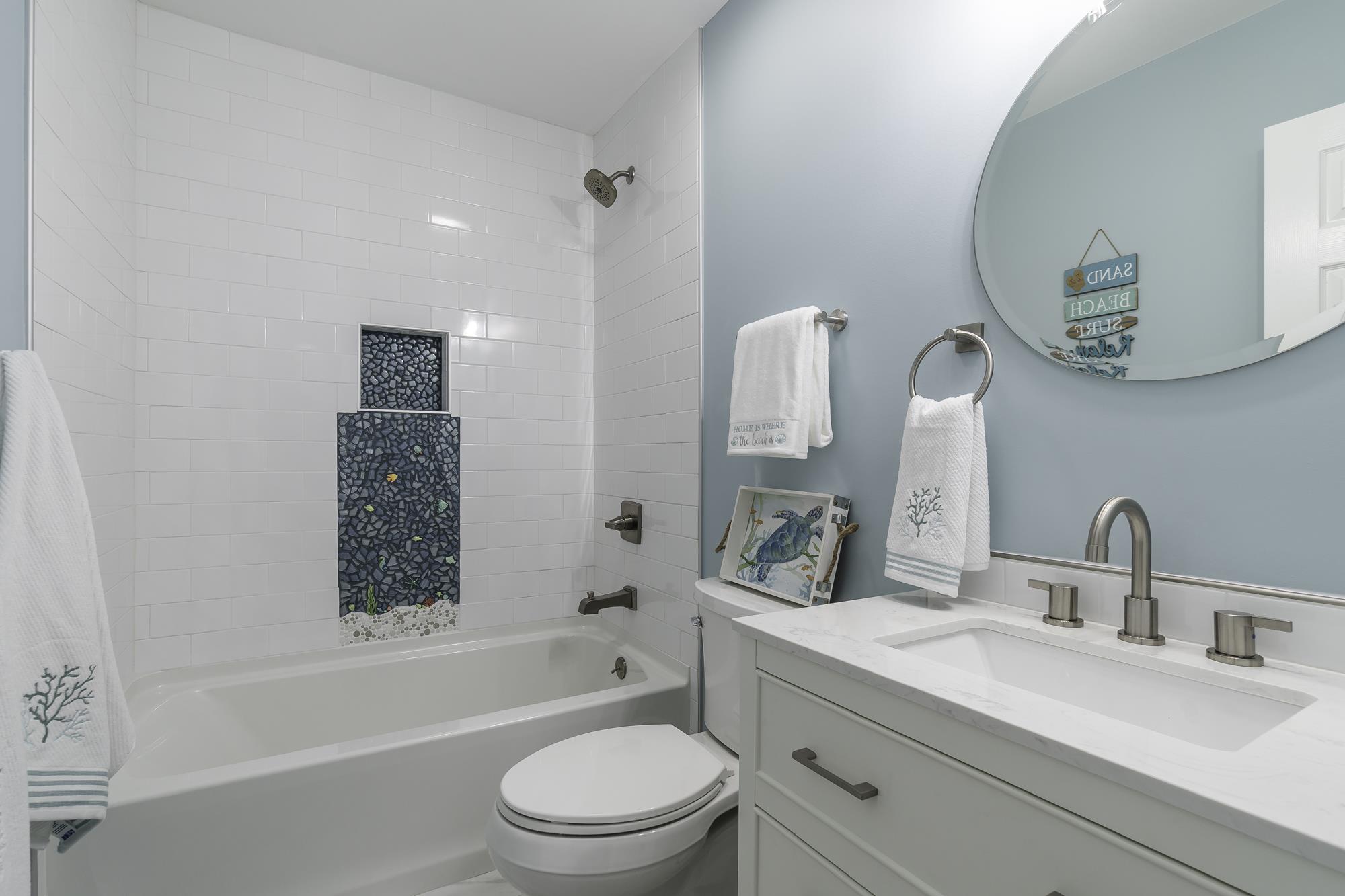 The bathrooms were completely renovated to offer a spa-like experience. Modern fixtures, including new vanities, mirrors, and lighting, were installed to improve both functionality and style. The showers were upgraded with contemporary tiles and glass enclosures, providing a luxurious feel. Custom tile work in soothing blue tones adds a touch of elegance and ties the bathroom design to the coastal theme of the unit.
