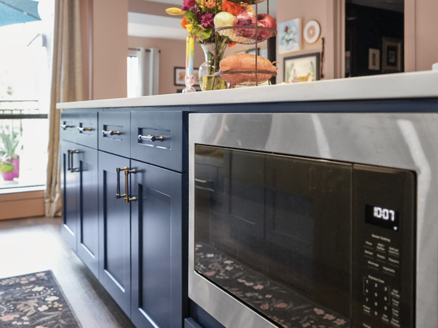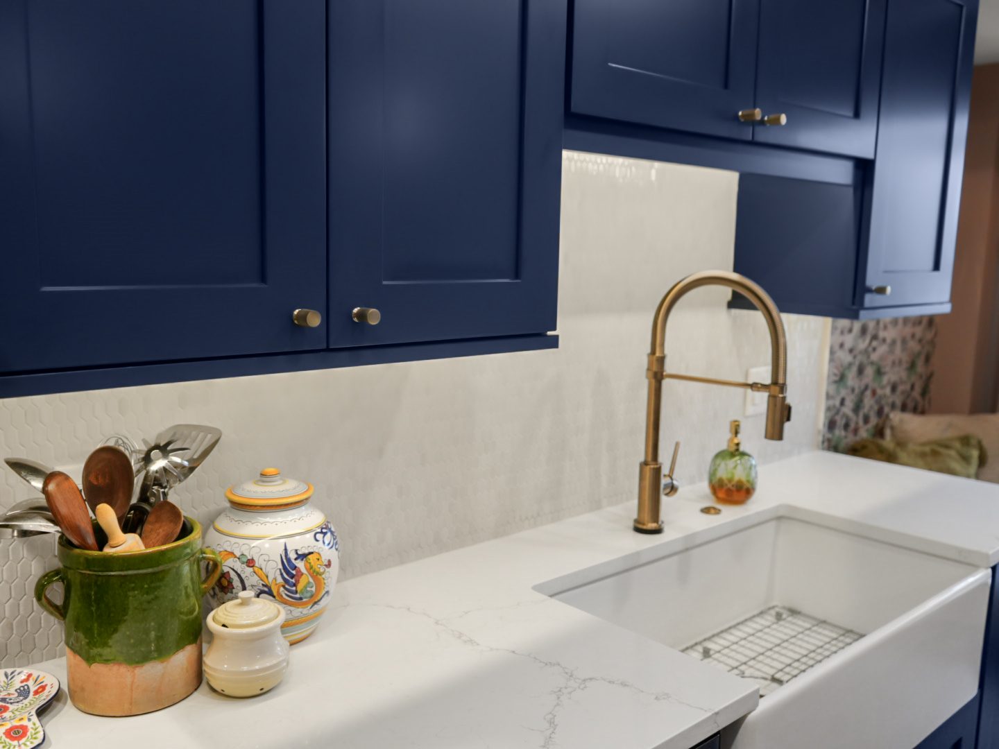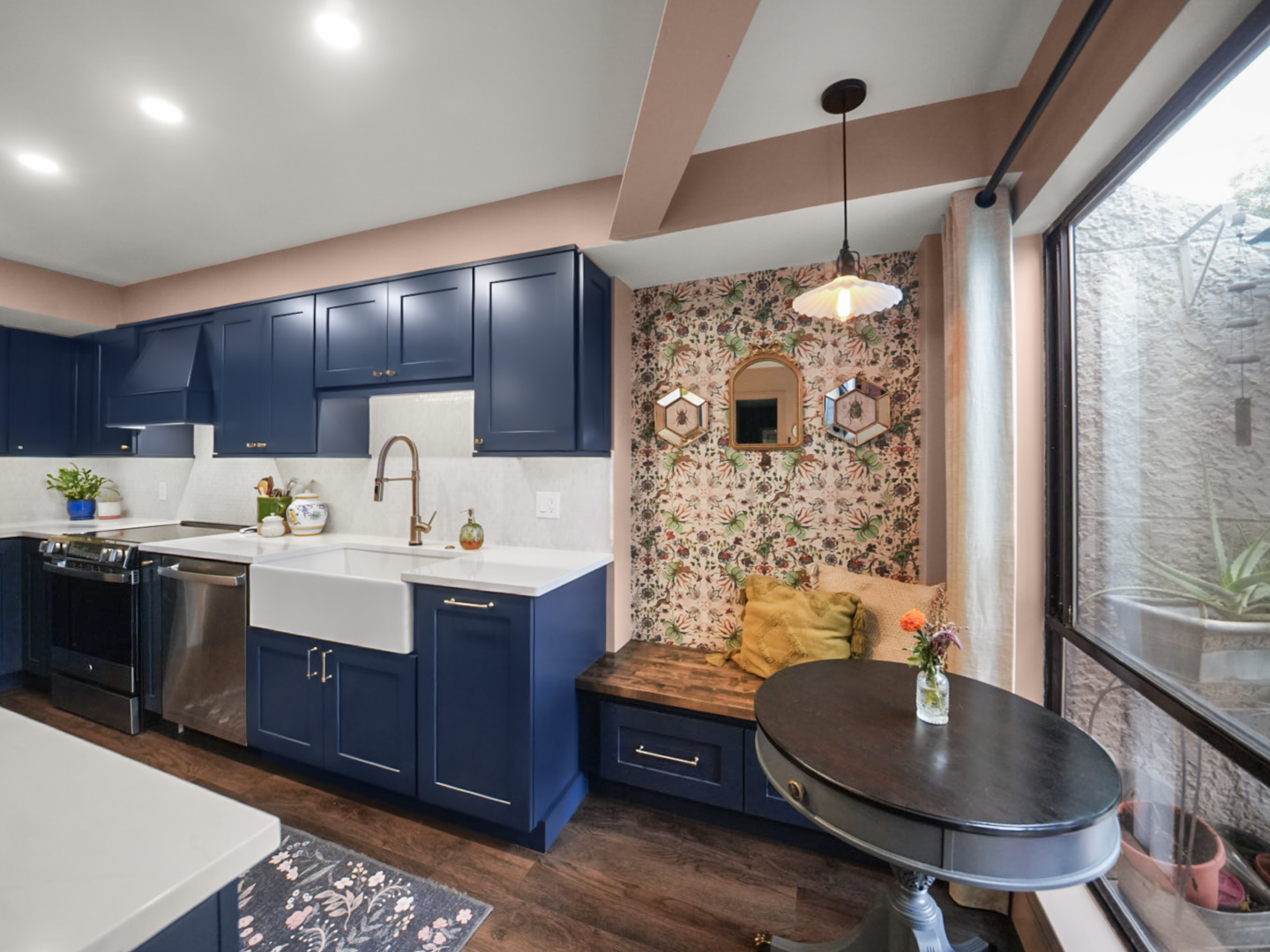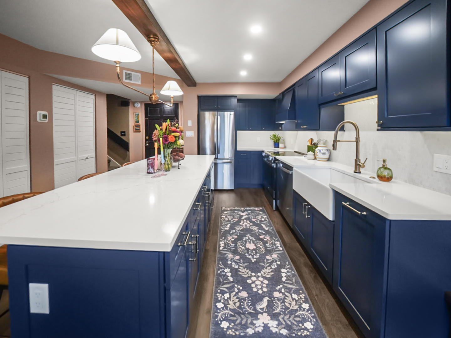 Deep blue custom cabinetry anchors the design, paired with quartz countertops that provide durability and contrast. A spacious center island serves as the focal point of the kitchen, offering generous seating and workspace for both everyday living and entertaining. Integrated stainless steel appliances and a farmhouse sink enhance performance while maintaining a cohesive, elevated look.