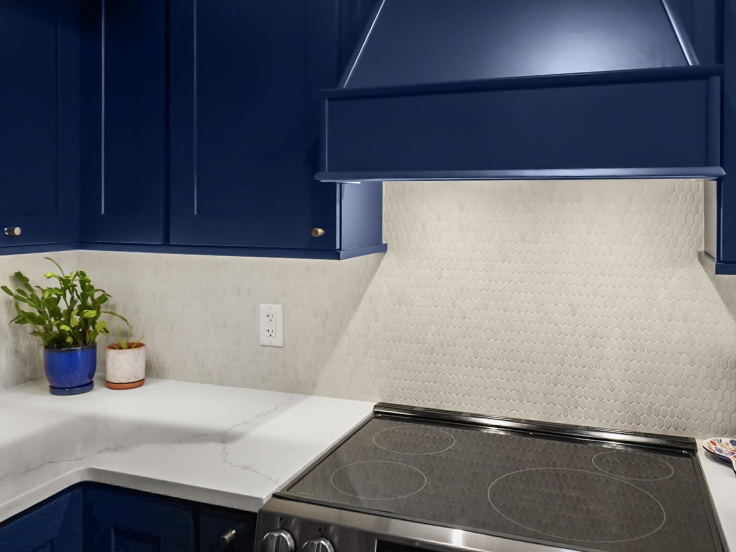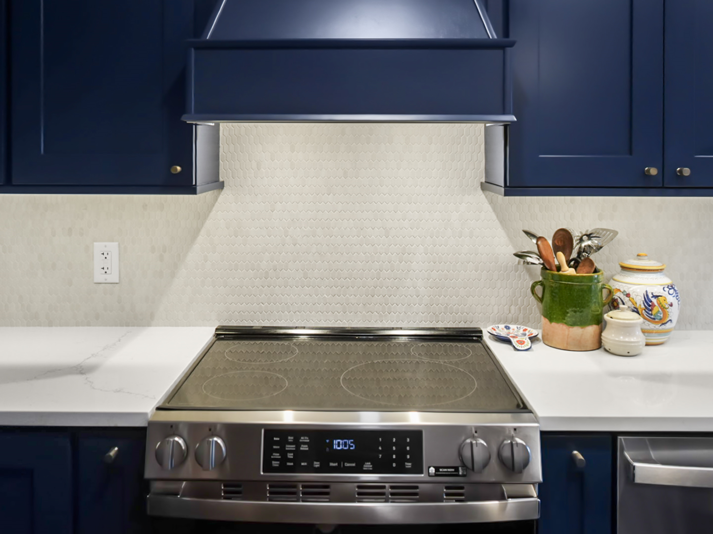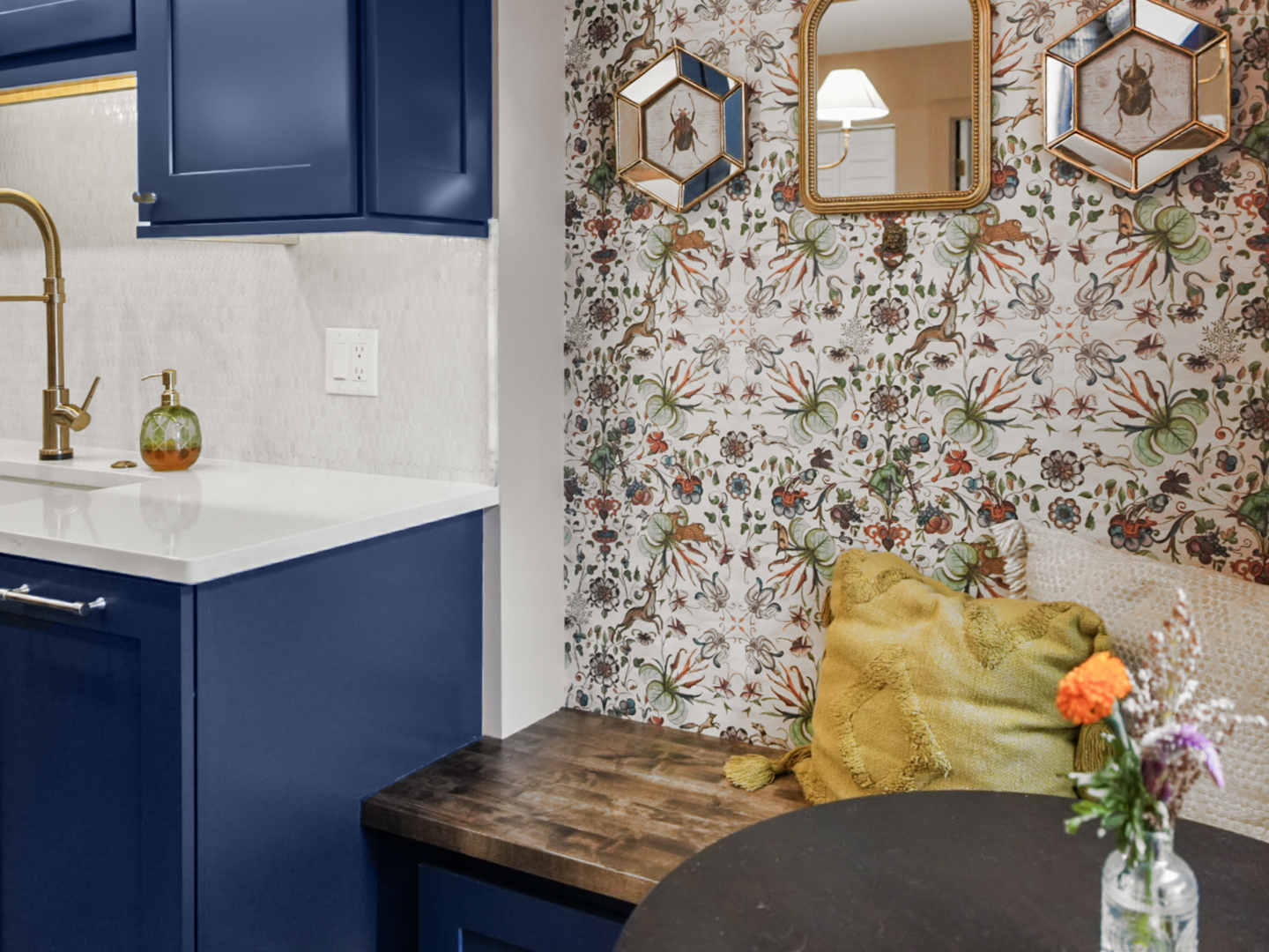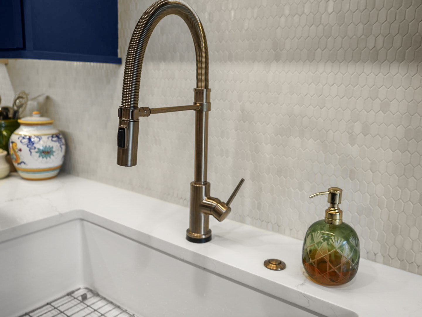 Deep blue custom cabinetry anchors the design, paired with quartz countertops that provide durability and contrast. A spacious center island serves as the focal point of the kitchen, offering generous seating and workspace for both everyday living and entertaining. Integrated stainless steel appliances and a farmhouse sink enhance performance while maintaining a cohesive, elevated look.